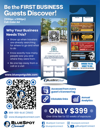 Every year, millions of families and RV travelers head to campgrounds across the USA—some chasing the best hiking trail, others escaping for a quick weekend, and many looking for adventure on the open road. But no matter why they arrive, the need is always the same: food, supplies, shopping, and a taste of the local scene. That’s where smarter campground advertising makes all the difference. BlueSpot Connect delivers one proven system—iConnectTags, rearview mirror tags with QR codes, paired with the BlueSpot Guide, a mobile resource that gives campers instant access to maps, property details, and local businesses. For travelers, it’s a convenience they’ll use daily; for campgrounds, it streamlines communication; and for businesses, it creates visibility at the exact moment guests are ready to spend.